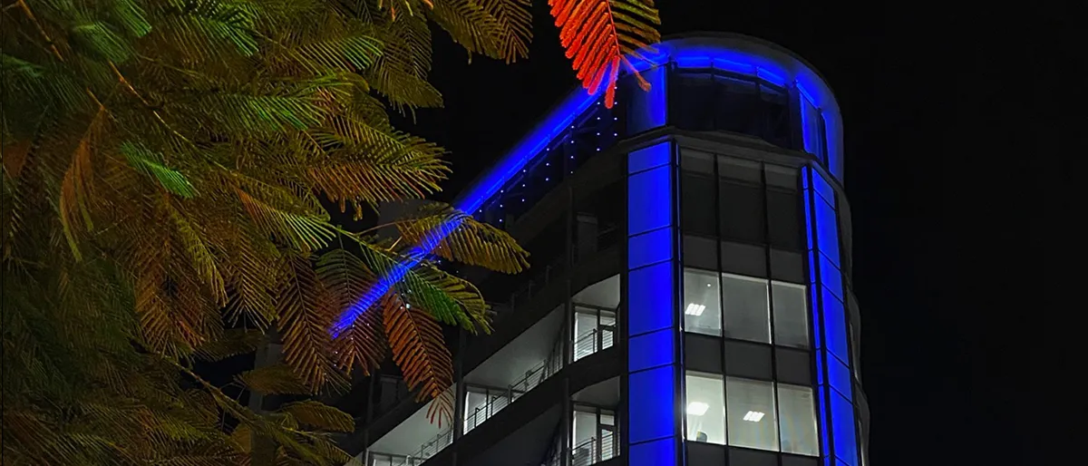 脳卒中の予防啓発の一環として、全国各地で 世界脳卒中機構のシンボルカラーであるインディゴブルーでライトアップが行われました。